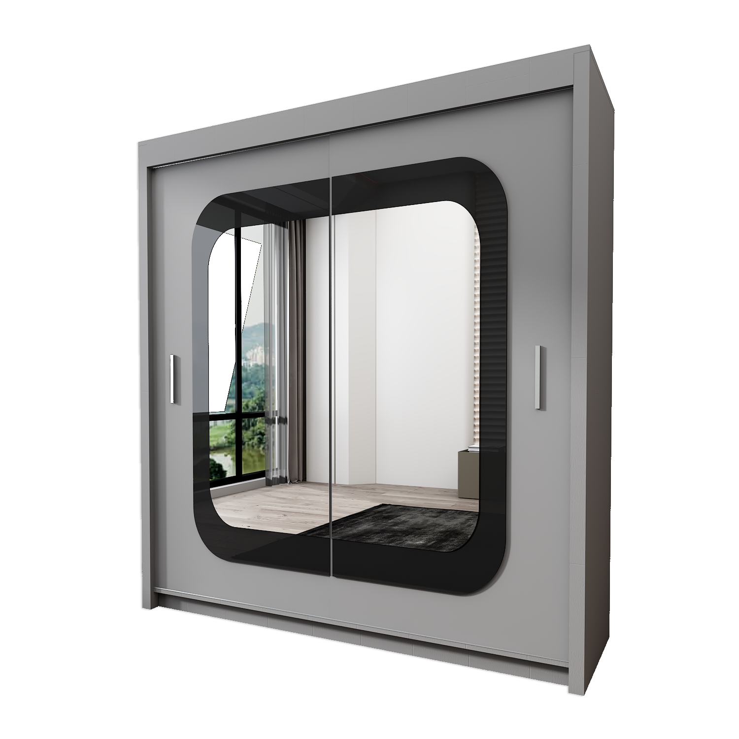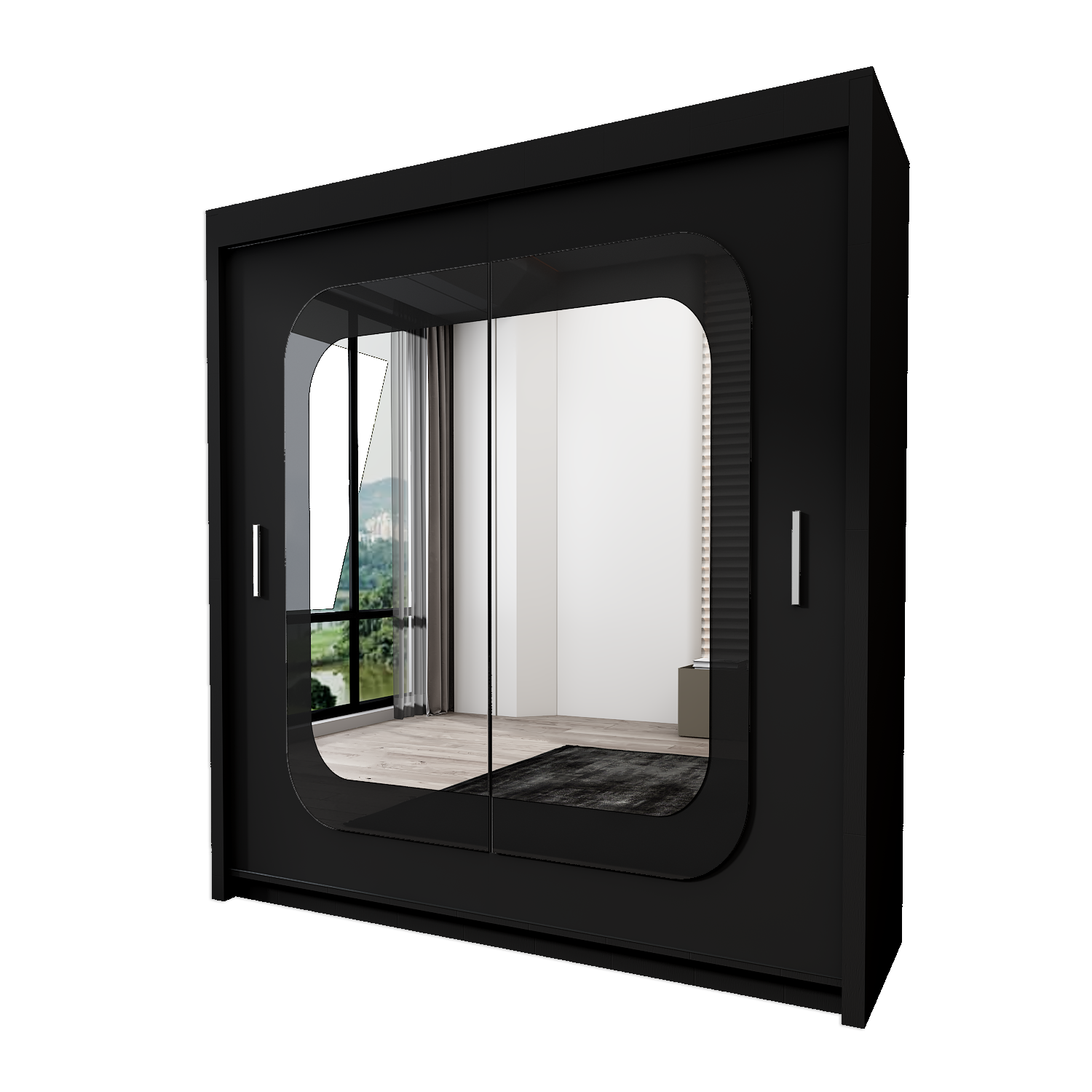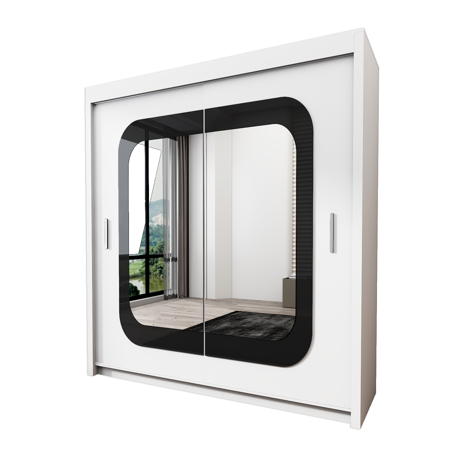Marika’s sliding door cabinet is made of high-quality laminate. The door of the cabinet is fitted with a mirror and on the sides are decorative strips in black gloss. These accessories give the cabinet an original and elegant look.