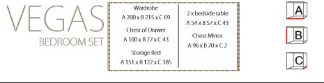 The Vigas bedroom has a dressing room with two sliding doors, one of which is upholstered and the other has a slightly smoky mirror giving it a modern and stylish design, the bed is upholstered both on the table and in the front; it has a metal mattress and storage space on the whole bed, a mirror comforter and 2 bedside tables with a drawer.